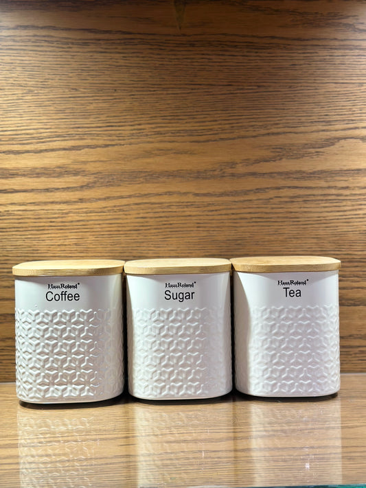 Tea Coffee Sugar Canisters, 1000ML 3 Piece of Metal Canister Storage Jar Container Set With Airtight Bamboo Lid
