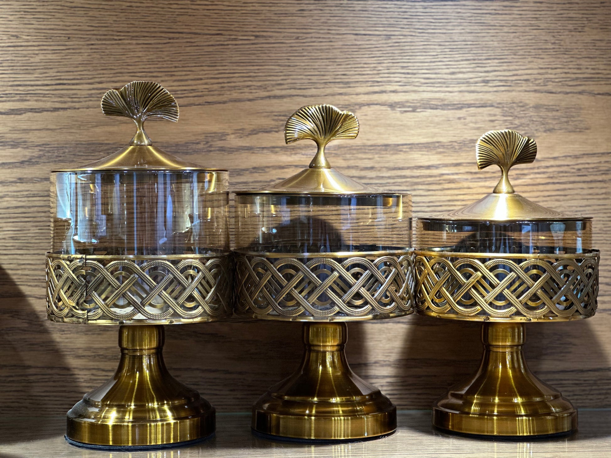 Elevate your home decor with this luxurious 3-piece decorative jar set, featuring clear glass containers with intricate gold metal filigree accents and elegant pedestal bases. Each jar is topped with a unique fan-shaped handle, making it both stylish and functional. Perfect for storing sweets, dry fruits, or simply as a statement piece for your living room, kitchen, or dining area. Crafted for those who appreciate timeless elegance and refined craftsmanship.