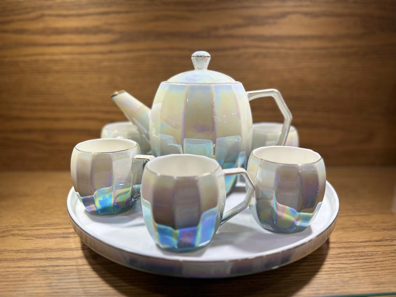 Product Description: Ceramic Cups, tray , and Kettle Set designed to enhance your tea and coffee experiences. Crafted with precision and style, this set is a blend of artistry and practicality.
